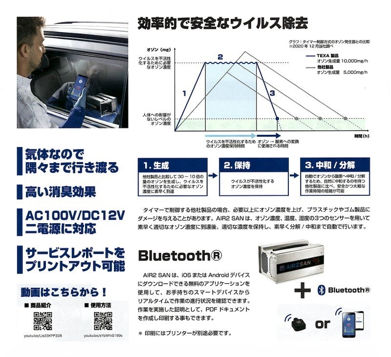 また、高濃度オゾンは車の内装にもダメージを与えますがTEXAの製品はセンサーで車内の状態を把握し 、適正な濃度のオゾンをすばやく発生させ、一定時間保持しその後、酸素に変換して施工完了。
